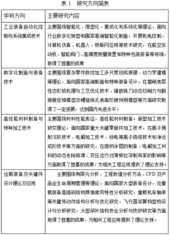 本学位点设有工业装备自动化控制与系统集成技术、数字化制造与装备技术、高性能材料制备与特种加工技术、运载装备及关键件设计理论及应用等4个主要研究方向,具体如下表所示。